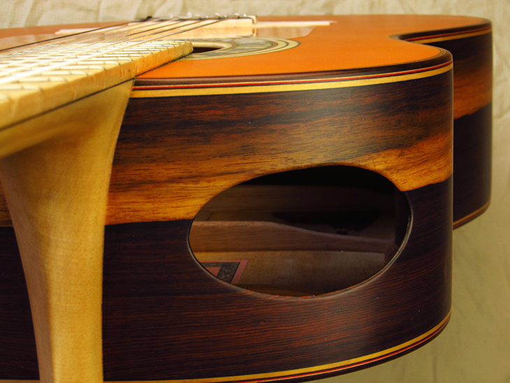 Model: Marcelo Barbero 1948 Top: Norway Spruce Bridge: Bird’s Eye Maple Fingerboard: Bird’s Eye Maple Neck: Maple Back and Sides: Bahía Brazilian Rosewood Color: Orange / Natural (French Polished)