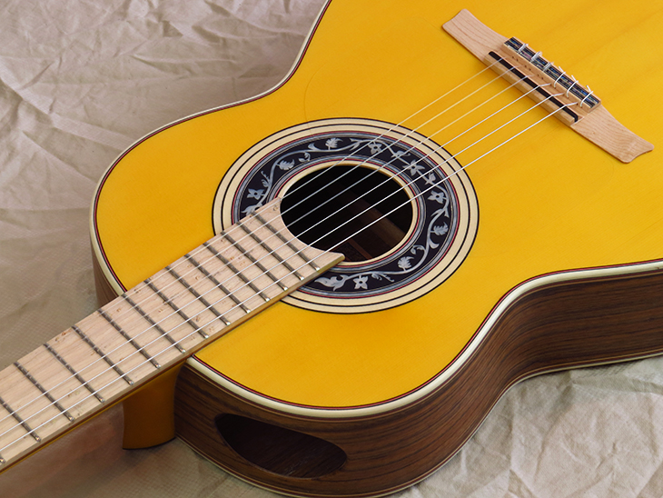 Model: Santos Hernández 1927A Top: Norwegian Spruce Bridge: Flamed Maple Fingerboard: Bird’s Eye Maple & Naseberry Neck: Flamed Maple Back and Sides: Ovangkol Color: Yellow/Natural